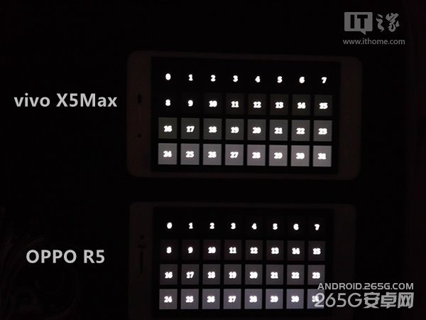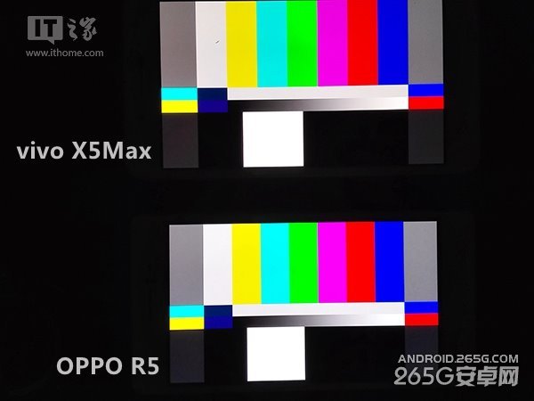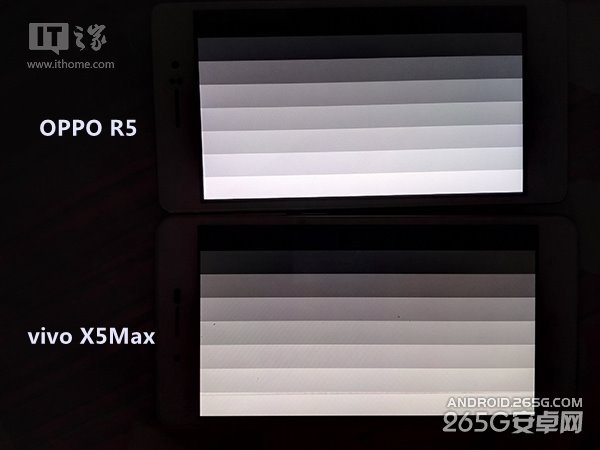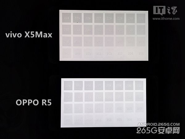 ▲从灰阶过渡来看,OPPO R5依然表现更好,但整体的亮度依然不够高,这也是AMOLED屏幕本身的特点。下方的vivo X5Max屏幕还有色温轻微偏暖的情况。