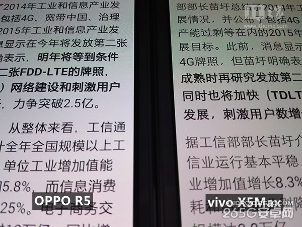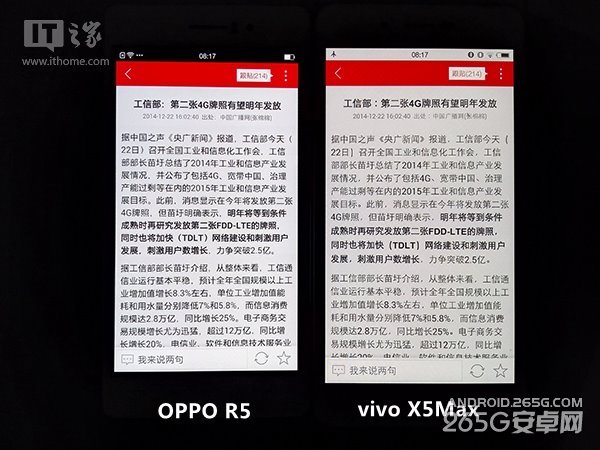 屏幕部分小结:通过屏幕显示效果方面的实际对比,OPPO R5凭借更高的亮度、以及小尺寸下更高的像素密度而取胜。但是vivo X5Max由于屏幕更薄、取消了中间的空气层,而使得触控手感来的更加直接。