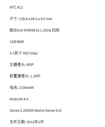 根据透露,这款手机将采用高通骁龙410处理器,内置1GB RAM,搭载了一块4.7英寸屏幕分辨率为1280X720。后置800万像素主摄像头,前置130万像素摄像头,采用基于Android 4.4版本的HTC Sense系统。内置2100mAh容量电池。