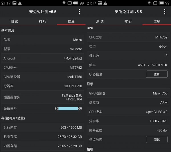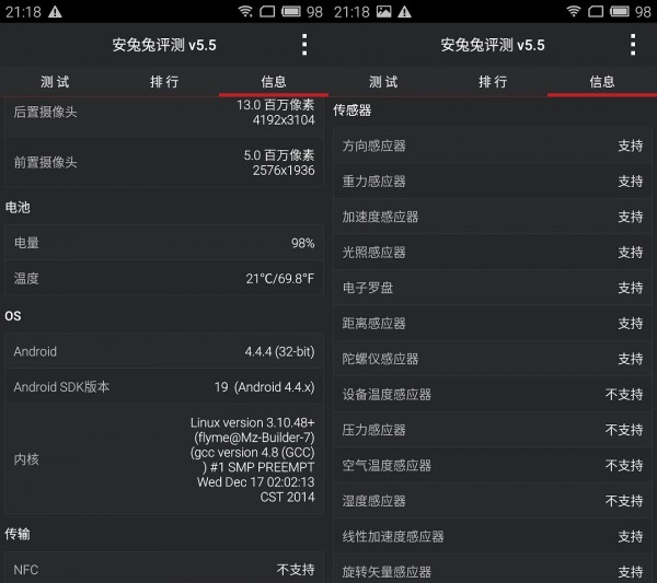 小编手头这部魅蓝Note是前黑后白的32GB版本,系统为基于Android 4.4.4的Flyme OS 4.2C。在跑分与日常操作过程中,该机的流畅度还是相当顺心的。