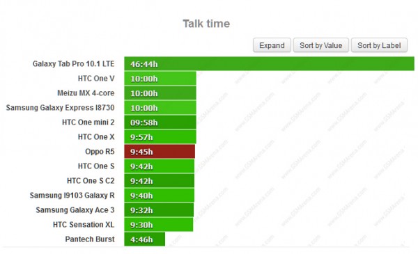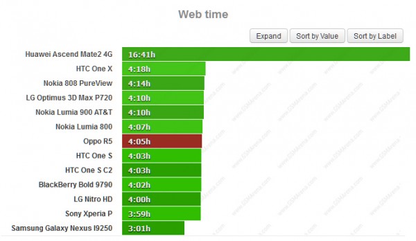 R5在连续3G通话测试中可以发现相比较OPPO同品牌其他产品来说续航还是显得有点糟糕,时间在10小时以下,介于HTC One S和HTC One X之间。