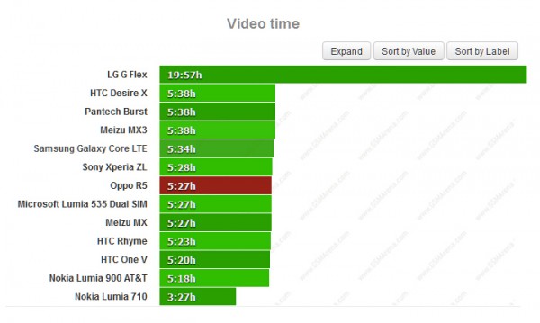最后进行的连续视频测试中OPPO R5在剩余电量发出10%警告之前持续了5小时27分钟。这足够用户观看三部电影,但是相比较其他手机来说续航方面依然不是很优秀。