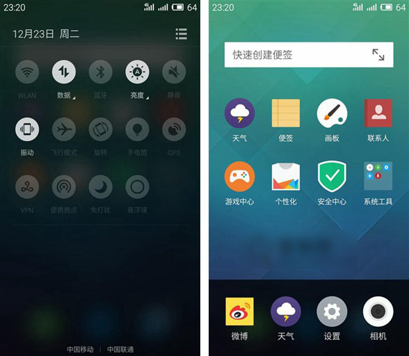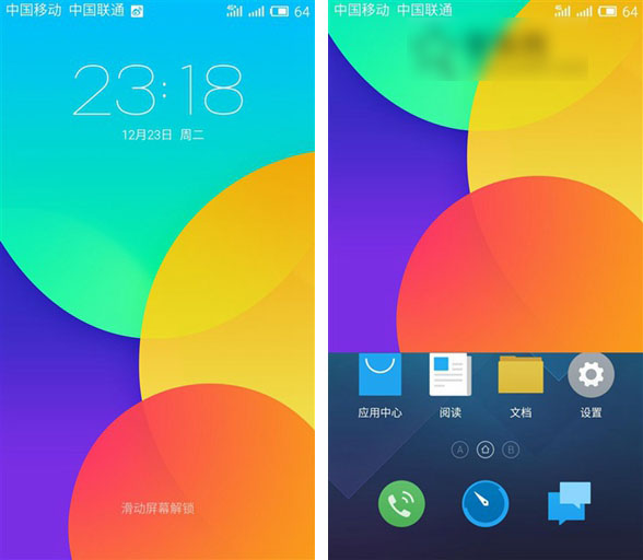 既然魅蓝Note所使用的是Flyme 4.1系统界面,那么在功能方面基本上和魅族MX4 Pro差不多,可能唯一区别最大的在于魅蓝Note不具备指纹识别功能。默认的壁纸和主题依然那么简洁大气。如下图所示