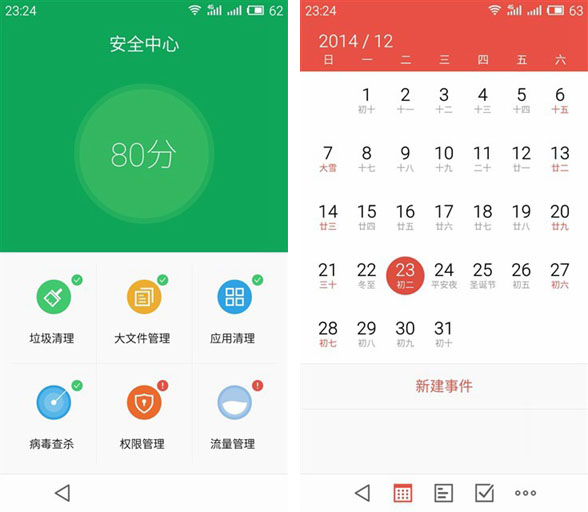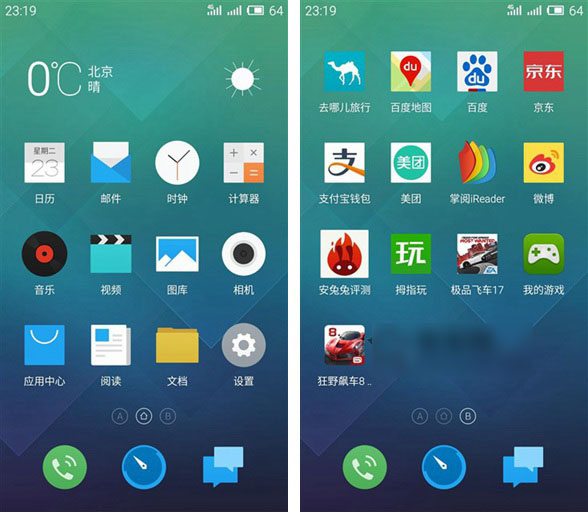 在系统方面,魅蓝Note运行的和魅族MX4 Pro一样的Flyme4.1系统,这比魅族MX4的Flyme4.0还要前卫。而我们在和之前的魅族MX4 Pro评测文章就提到过,Flyme4.1主打界面清晰,采用扁平化设计风格,新增很多具有特色的功能,用户体验效果更人性。下面让我们再一次体验Flyme4.1用在魅蓝Note身上的效果。
