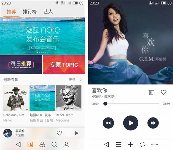 音乐界面,我们会看到其屏幕上方有一个黑条,采用了一体化的整合,使得界面看起来更接地气,如下图所示。