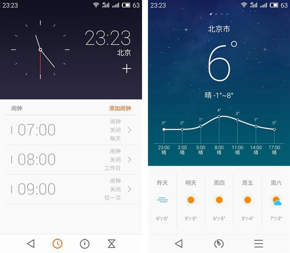 打开时钟和天气界面,我们会看到Flyme4.1有不一样的地方就是天气会跟随温度以及是白天还是晚上显示不同的界面效果,这在魅族MX4 pro评测一文中笔者也提到过,我们就不过多的介绍了,如下图所示。