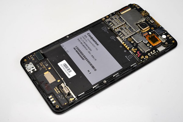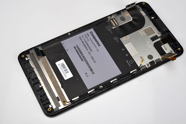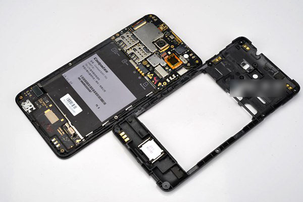 大神F1 Plus采用可拆卸后盖与电池设计,打开后盖就可以看到内部的双SIM卡槽和SD存储卡槽了。大神F1 Plus内部结构比较简单,采用螺丝加上卡扣的结构,如下图所示。