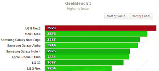 从图中可以看出,G Flex 2排名第一,而Note Edge排名第三,两者相差642分,性能大约提升了20%,差距还是十分明显。当然两者运行的系统版本不一样,如果Note Edge也升级到最新的Android 5.0系统再进行比对,结果可能更加精确。
