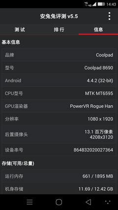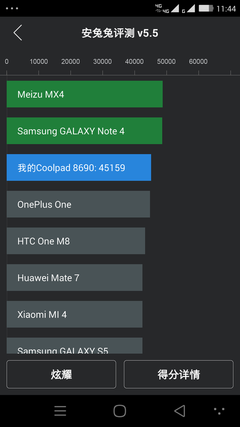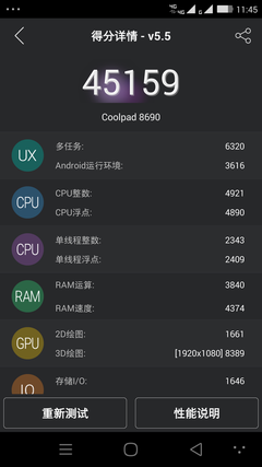 大神X7安兔兔测试分数是45159分,稍微逊色于采用同样CPU的魅族MX4,由于A17架构带来非常出色的效能,安兔兔测试的CPU运算部分得分非常高,直接将安兔兔的分数拉高,大神X7的理论性能相当出色。