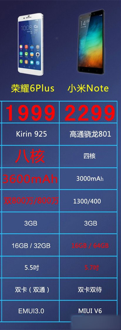 从配置来看,小米note和华为荣耀6 plus并没有明显的差距,只不过小米note支持双卡4G,而荣耀6 plus支持双卡4G,但是荣耀支持SD卡扩展内存与拥有更大的电池,续航更好一点。