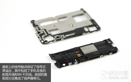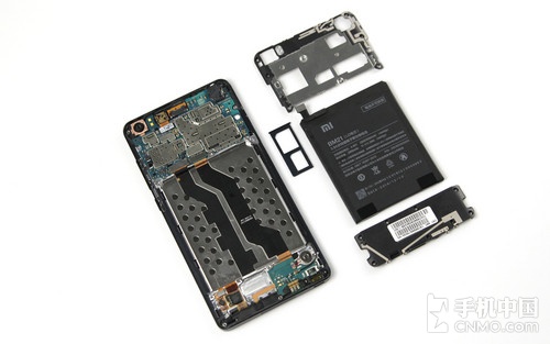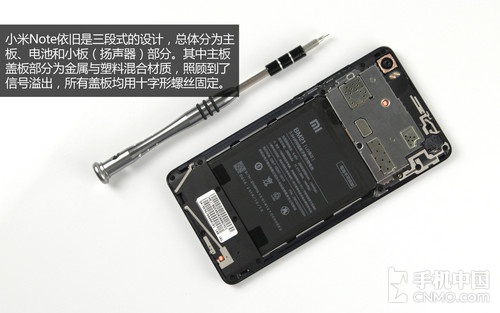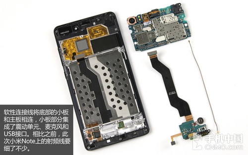 再来看拆开后的机身内部,小米Note依旧是三段式的设计,总体分为主板、电池和小板(扬声器)部分。其中主板盖板部分为金属与塑料混合材质,照顾到了信号溢出,所有盖板均用十字形螺丝固定。