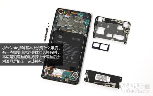 小米Note拆解基本上没有什么难度,有一点需要注意的是螺丝长短有别,本应是短螺丝的地方拧上长螺丝后会对液晶屏挤压,造成损坏(目前这部机器的屏幕已经出现明显黑斑)。