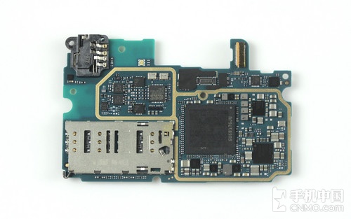 主板正面仅露出了几个比较重点的芯片,该部分的屏蔽罩本身已经内嵌在了中框部分。此外该面占空间最大的部分就是支持双卡双待的SIM卡槽了。