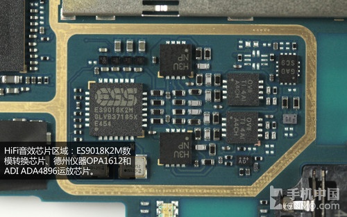 整个HiFi音效芯片区域:ES9018K2M数模转换芯片,它是ES9018的移动版本,手机中最先使用这块芯片的是vivo,随后魅族、小米也都采用了这款芯片,是目前智能手机中比较旗舰级的Hi-Fi芯片。此外小米Note还使用了德州仪器OPA1612运放芯片和ADI ADA4896运放芯片。