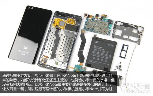 通过拆解我们不难发现,小米的做工在小米Note上体现得淋漓尽致,非常的熟悉,在内部的设计和做工上还是主流的,也符合小米一贯的水准,但没有特别大的创新。此次小米Note最主要的改进是在外部的设计上,确实让人耳目一新,所以说最有设计感的小米手机就是小米Note并不为过。