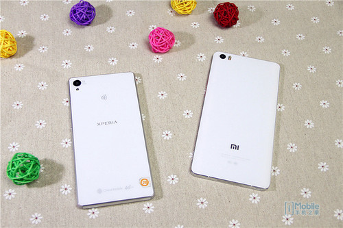 索尼Z3在机身背面中央设计XPERIA的标识,小米标识设置在了机身下方,由于尺寸过大,相对而言背面设计略单薄。