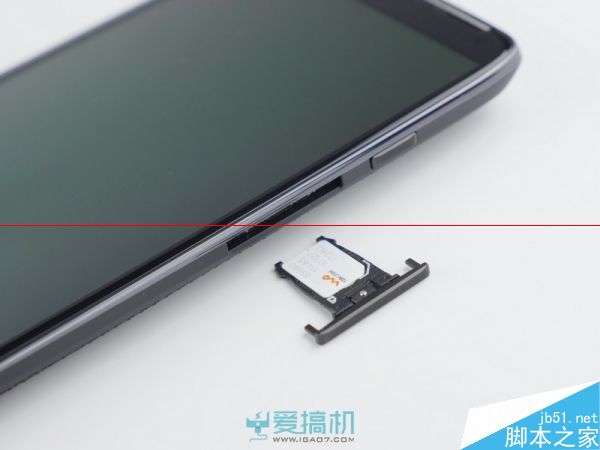 可能各位会觉得有点奇怪,Droid Turbo并不能拆卸后盖,机身也不见有卡槽的位置,实际上它的卡托和音量键是一体的,这样的设计很少见。我们在手机背部在音量键的位置把卡托抠出即可。
