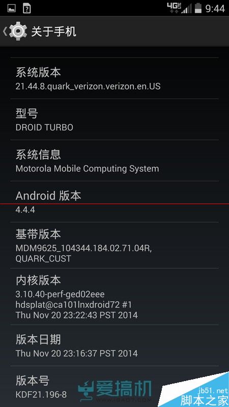系统采用了Android 4.4.4,系统内核版本3.10.40,Droid Turbo使用了高通MDM9625基带。这款基带相当强大,理论上支持CDMA2000(1X Adv/EV-DO Rev. A/B)、GSM/GPRS/EDGE、UMTS(WCDMA/TD-SCDMA)、LTE(LTE-FDD/LTE-TDD)等网络制式,支持最高LTE Cat.4,当然,这只是理论,看看就好…