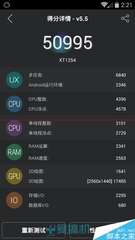 安兔兔评测跑分…这个测试给人的感觉意义不大了,我们就当例牌的娱乐环节跑一下,Droid Turbo超过了5万分,发挥得不错,三星和LG使用骁龙805的手机要上5万会比较困难,其中3D绘图成绩超过了17000分。