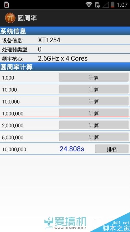圆周率1000万位,主要针对的是CPU单核性能,Droid Turbo凭借高达2649MHz的超高主频获得了24.8秒的成绩,表现不错。