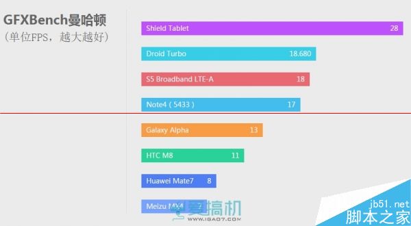 GFXBench OpenGL测试,Droid Turbo的发挥也是符合骁龙805的水准的,当然也没有太大惊喜。