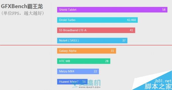 我们和主流的手机对比一下这项测试的帧数,可以看出Droid Turbo的图形性能在手机里面还是名列前茅的,但是对于怪兽级的Tegra K1来说,还是有较大差距。