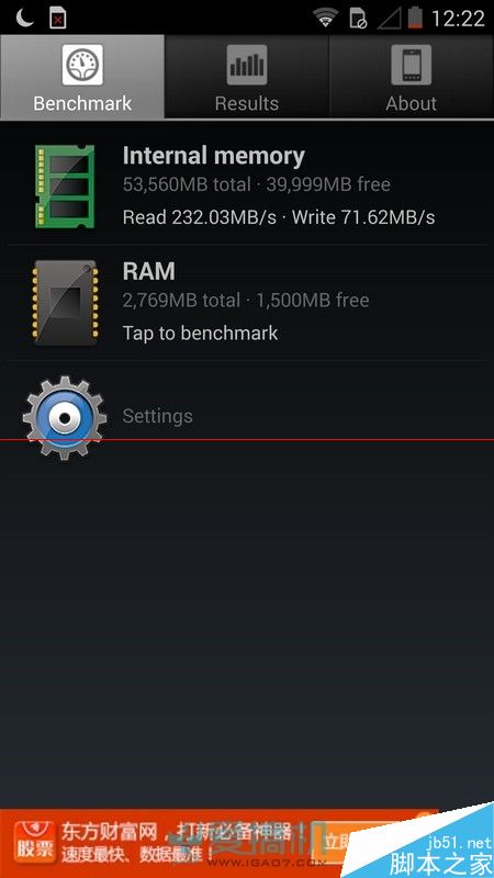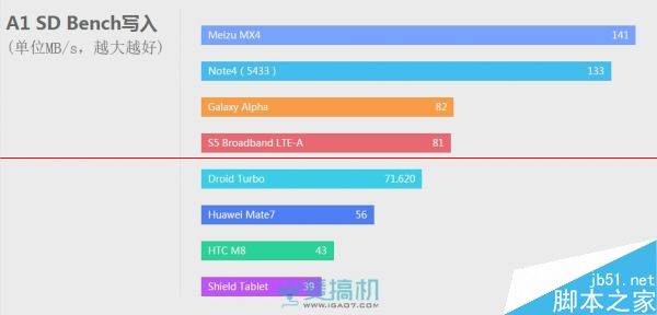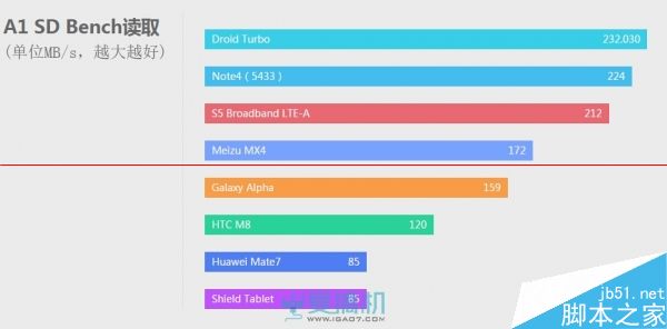 A1 SD Bench闪存性能测试,Droid Turbo使用了eMMC 5.0规格的闪存,所以在测试中也获得比较出色的性能表现。