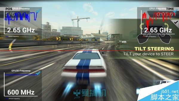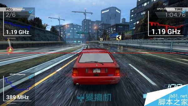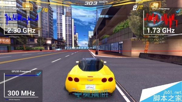 我们也进行了狂野飙车7的测试,在这个游戏中,刚进入游戏GPU频率就仅剩下300MHz…