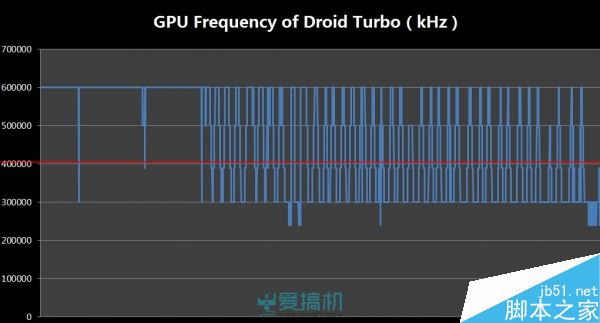 我们来看看在短短几分钟的游戏测试中,Droid Turbo的GPU频率变化,可以看到游戏一开始的时候基本能保持在600MHz,中段频率波动较大,到尾段甚至已经有一段时间跌入300MHz。