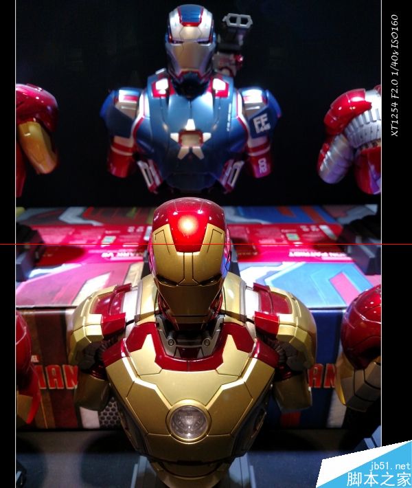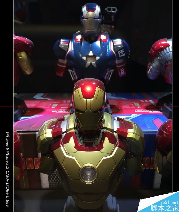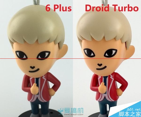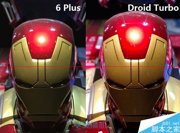 第三组样张,Droid Turbo的色彩表现依然给我们留下较好的印象,而且虚化效果也比iPhone 6 Plus更出色,不足的地方依然是解析力。而iPhone 6 Plus的色彩表现让我们大跌眼镜,留意钢铁侠的金色盔甲已经有明显发绿的倾向,缺少金色应有的光泽。