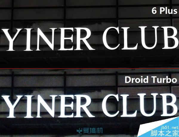 另外一组夜景样张,情况和上一组类似,而且差距拉得更大,iPhone 6 Plus依靠光学防抖和出色的优化,画面更纯净,解析力明显高出许多。这一个场景Droid Turbo的ISO竟然拉高到1600,所以画面的噪点比较多,而iPhone 6 Plus的ISO仅有200。可以看出iPhone 6 Plus在夜景中会尽量压低ISO以换取较高的画面纯净度,利用光学防抖就算曝光时间较长也不会导致“糊片”。