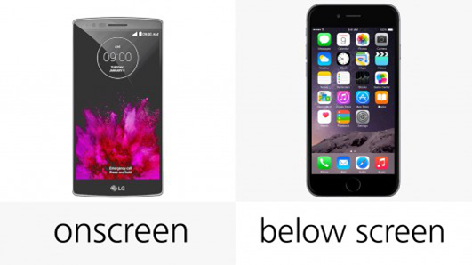 iPhone提供了唯一一个实际的按钮,其位于屏幕下方。而G Flex 2的导航按钮在界面下方。