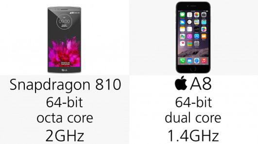 这是另一个看上去G Flex 2占尽优势的方面,但是比拼核的数量及钟频属于纸上谈兵,iPhone的实际性能具备绝对说服力。