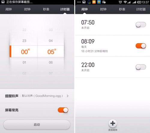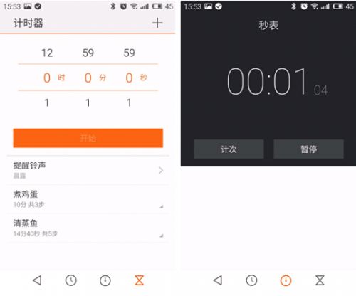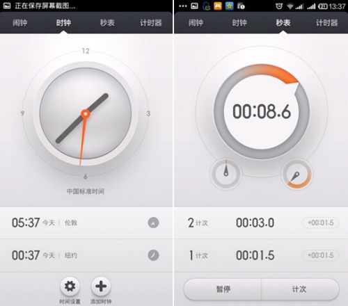 基本上所有Android平台的时钟应用都融合了时间现实、世界时钟、秒表和计时器的功能,操作方式各有不同,但是实际上功能一样。畅玩4X的时钟根据手机主题优化,黑色界面为主色调,为了推出稳重大方的风格;魅蓝Note设计有些凌乱,世界时钟和时间集中在一起风格不统一,简洁的风格也没有体现出来;大神F2的整体设计统一简洁,虽然有些兀突但一目了然;MIUI尽管设计样式上风格是统一的,不过不同的功能用了不同的表现手法,看上去有点乱糟糟,但也有人认为这是区别功能的鲜明特征;乐檬K3的时钟设计扁平化到了极致,堪称简洁时钟的典范,一切样式都为了功能,没有一点冗余,不过与“美观”二字无缘。