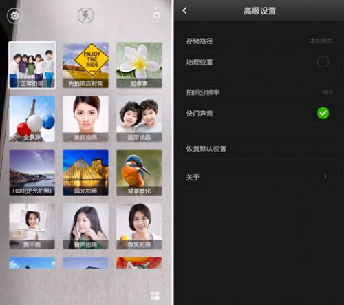 相比MX3使用的Flyme系统自带拍照软件,魅蓝Note有了长足进步。除了保持之前相机应用简介的界面之外,将多重拍照模式隐藏其中,包括慢镜头、微距、夜景、广场、全景、自动、手动和美颜,增加了扫码功能,默认是自动拍照模式。在后期处理上,增加了多种风格化模式。