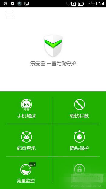 乐安全也算大家熟悉的安全引用了,包括流量监控、手机放到、隐私保护、病毒查杀、手机加速、骚扰拦截等等,电池控制联想有专门的应用,所以在安全应用中没有选项。