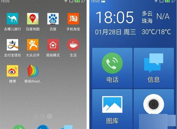 魅蓝手机加入了简易模式,这一模式其实在不少其它品牌的手机上也已经见过了,换句话说就是变种的老人模式。选择这一模式后,图标、字体等桌面元素都会以大字号显示,某种程度上对老年人而言很适用,毕竟让上岁数的人直接接触Flyme还是有点上手困难的。此外Flyme 4.2加入了全新的app——生活服务,能够针对用户的使用特性和习惯进行定向推荐,这一app近期将在应用中心上架体验版。