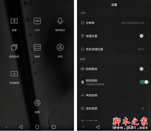 Mate7的拍照界面非常简洁,用户可以通过在底部滑动在拍照和摄像之间进行切换。所有的拍照选项都隐藏在设置菜单中,除了之前提到的美肤功能和旗舰机上常见的HDR拍照功能外,Mate7还提供了横向和纵向两种全景拍照模式,并添加了全焦拍照(先拍照后对焦)、对焦和测光分离等功能。
