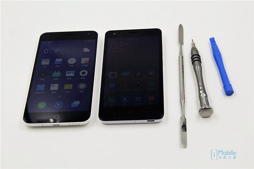 首先魅蓝和红米2都是未经过拆解的新机,送上拆解前两款产品和拆解工具的靓照合影。