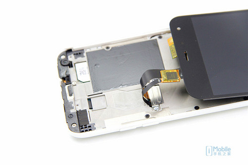 魅蓝的SIM卡槽取出,拆解陷入了僵局,魅蓝属于一次性封胶成型,首先需要拆解的是屏幕。第一步的拆解难度相对于红米2大很多,付出了近40分钟才在保证机身等方面安全的情况下拆下屏幕,然后我们看到的依旧不是内部构造而是隔离板。两款手机在这方面来看,魅蓝相对于红米2初装成本更高,难度也更大。