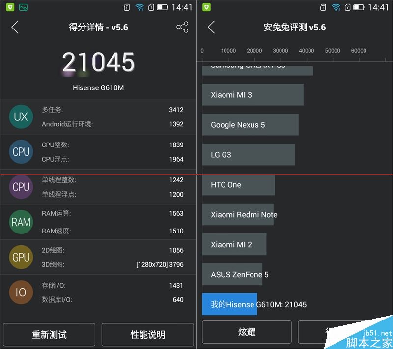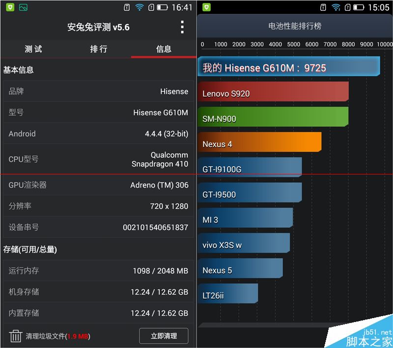 海信G610M的安兔兔跑分为21045分,搭载64位高通骁龙410四核处理器并配备2GB RAM,系统运行流畅。在续航方面,提供3000mAh超大容量电池以带来超长的续航条件,在实际使用中带来更好的体验。