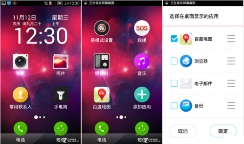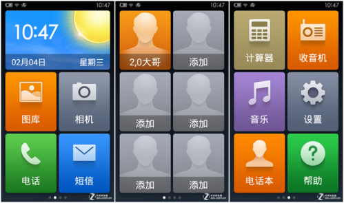 从功能方面上来讲,目前老年用户对手机已经不是简单的短信、电话,而是需求更多的功能,如IM聊天、拍照、音乐等,因此无论是硬件还是UI方面都应该赋予其更高的配置。特别是在功能图标应该更加丰富,当然也可以增加手势操作或者语音操作在易用模式当中。