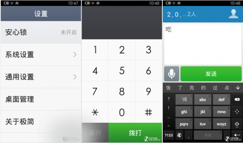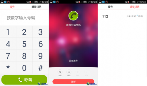 接下来,再看看一些基本功能,比如拨号界面。我们可以看到,其数字键盘几乎已经扩大到最大值,并且每个按键的触摸有效范围也非常大,能够很好的方便用户点击和查看。然而,在呼出界面依旧字体较小,不过笔者看来关系不大,大部分年长用户在该部分很少进行其他操作。