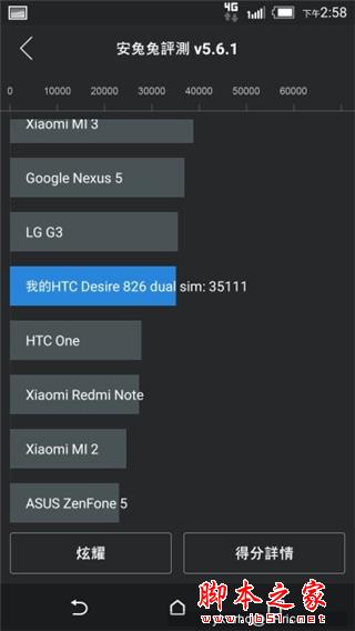 ▲Desire 826 搭载高通骁龙 615 处理器,跑分达到 35111 分,相比 Desire 820 有显著的提升,不过相比搭载了骁龙 801 的 Desire Eye 还是有一定的差距。
