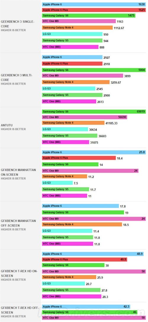 Phonearena近日就找来了Galaxy S6、HTC One M9以及苹果的iPhone 6、iPhone 6 Plus,此外为了能反映她们相比上代产品的提升水平,还加入; Galaxy Note 4(Exynos 5433)、LG G3(骁龙801)、Galaxy S5(骁龙801)、HTC One M8(骁龙801)等机型作为参照,一起来看看。