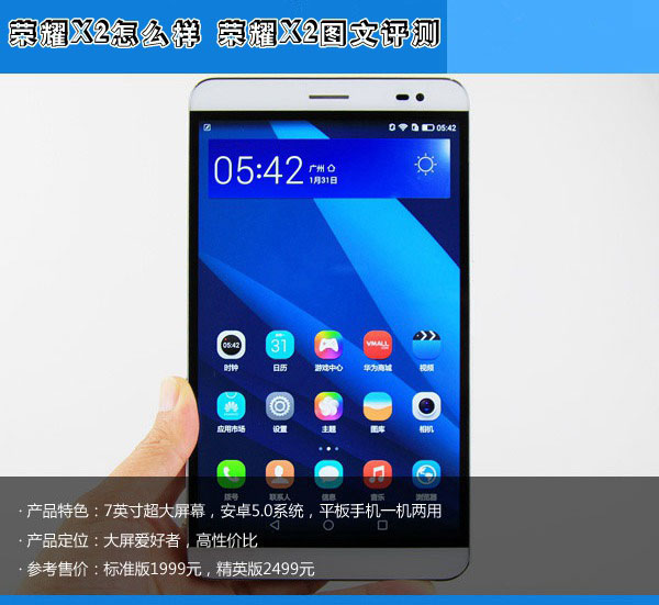 荣耀X2之所以能够成为受用户欢迎的平板手机产品,与其大胆采用的7英寸屏幕和1999元价格定位是互相呼应的。在外观设计上,荣耀X2舍弃了轻薄选择了稳重,自成一种风格。在手机硬件性能上,采用自家八核芯片和3GB超大运行内存,足以担任平板手机的角色,同时拍照性能上也达到主流安卓手机的水准,搭载基于安卓5.0系统开发的EMUI美观稳定。可以说,荣耀X2是一个性能均衡、目标用户明确的一款平板手机,价位若可以下探一些,或许会更受欢迎。