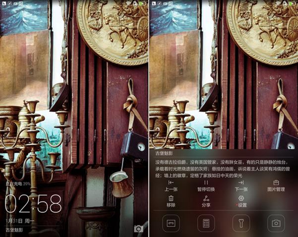 在锁屏界面上,EMUI采用扁平化设计风格,整体感觉干净利落丝毫没有累赘感,整个锁屏界面就是一个幻灯片,在界面下方除了有日期、时间、相机快捷键之外,如果用户向上滑动手指,还有该图片的文字说明以及幻灯片的播放按钮与几个常用的功能快捷键。