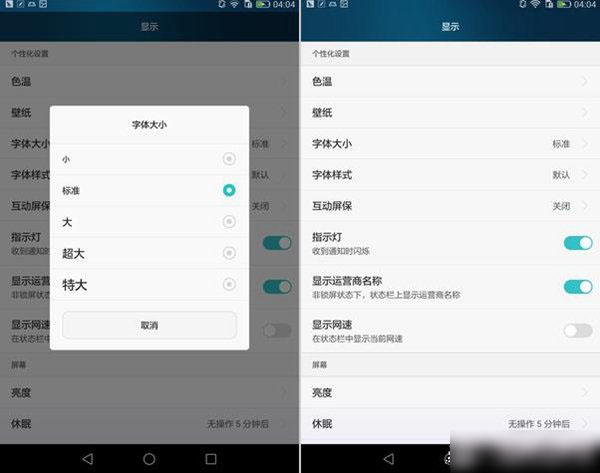 虽说荣耀X2拥有7英寸超大屏幕,但对于小编这种眼残(脑袋没事)的人来说,字体还是太小不能看清,所以EMUI3.0保留了显示字体大小的设置,设计非常贴心。
