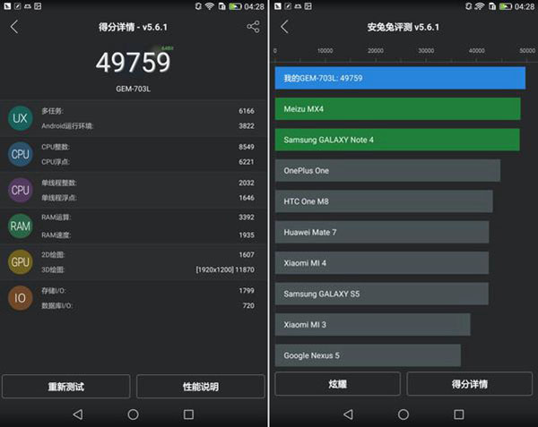 从鲁大师和安兔兔的评测结果我们可以看到,拥有海思Kirin 930 2GHz处理器与3GB Ram的荣耀X2性能领先魅族MX4与三星GALAXY Note 4。