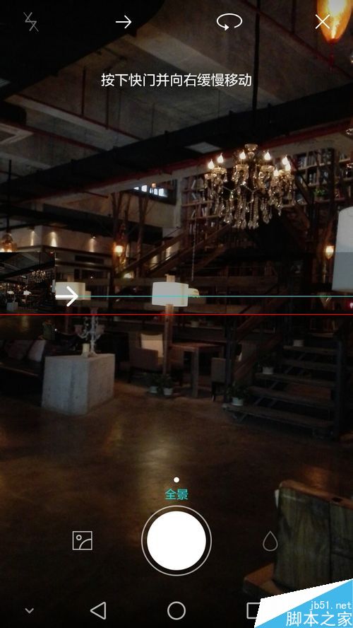 5、进入全景拍照模式后,屏幕上会提示”按住快门并向右缓慢移动“。按照提示,按住快门,将相机移动到你需要拍摄的场景的起点处,松开快门,此时会完成全景照片的起点的拍摄。